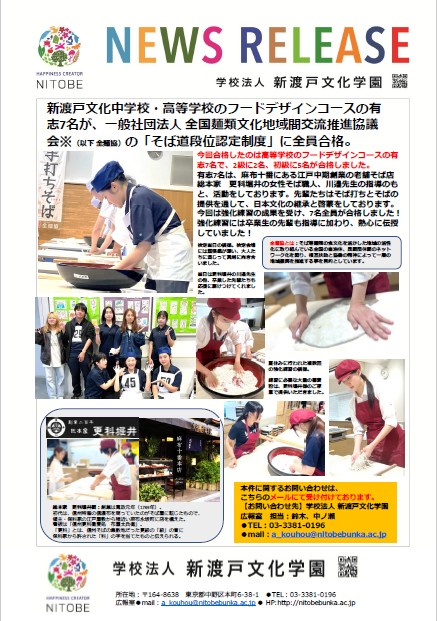 新渡戸文化中学校・高等 学校のフードデザインコースの有志 7 名が、一般社団法人 全国麺類文化地域間交流推進協議
