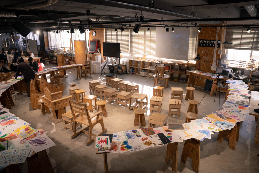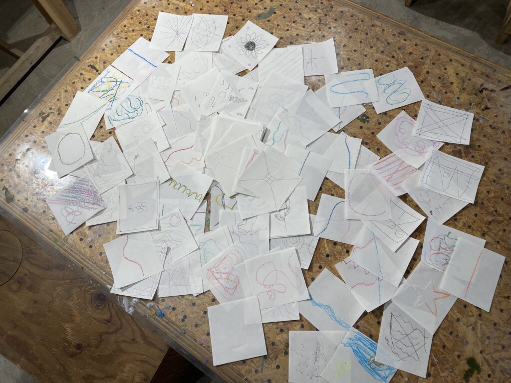 これまでの304の作品を全て空間に広げ、1人1人に304枚の作品とアウトプット作品をまとめた冊子を渡して、最終授業開始!