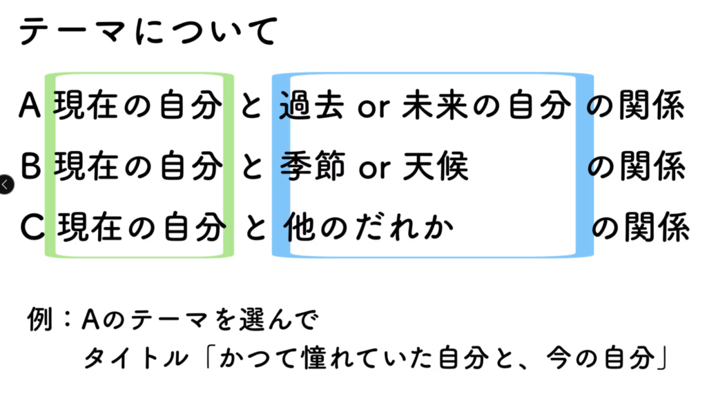 これまでトータルで8コマ分ほど自由にいろんなものを使ってテーマに取り組み、互いに表現を見出していった。これまではそれが図の赤丸 そしてここからは→の部分の作業