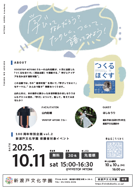 山内と共に、本を制作に携わった本校の卒業生のほしなうりさんもゲストに招き、「学び」について、話して、考えてみませんか?