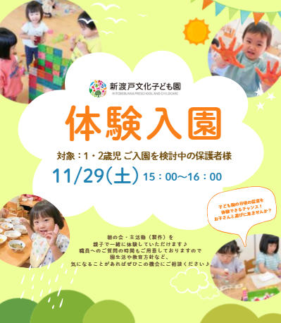 1.2歳のお子様のご入園をご検討されている保護者様向けに、体験入園を開催いたします♪