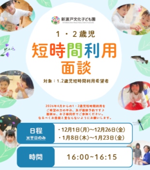 新渡戸文化子ども園では、2026年4月からの 1・2歳児 短時間利用 をご希望の方向けに、面談を実施いたします♪